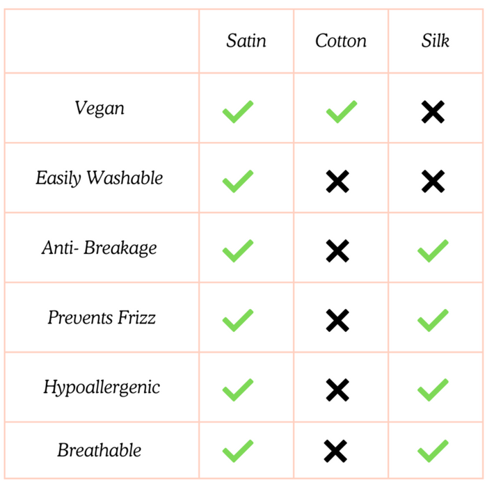 While silk offers similar benefits, it’s made from animal-derived fibers and can be expensive and high-maintenance. Satin (especially satin polyester like ours) is vegan, cruelty-free, and more affordable, while still giving you that same smooth, frizz-fighting finish without the guilt or the high price tag.